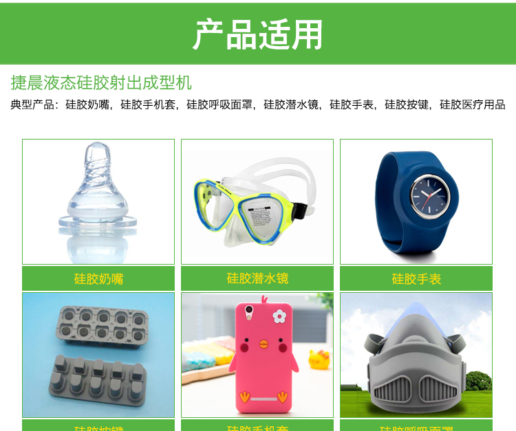 1、各類模壓廠品改換成液體硅橡膠注塑成型的灌洗課外作業。 2、涂裝、嬰童專專的日備品、學齡前專專的日備品、運動專專的日備品、廚衛專專的日備品、電子設備物品等制造業的穿刺上班。 典范成品:硅橡膠奶嘴,硅橡膠蘋果六手機套,硅橡膠享受口罩,硅橡膠潛水鏡,硅橡膠電子手表,硅橡膠側鍵,硅橡膠醫療器械器具