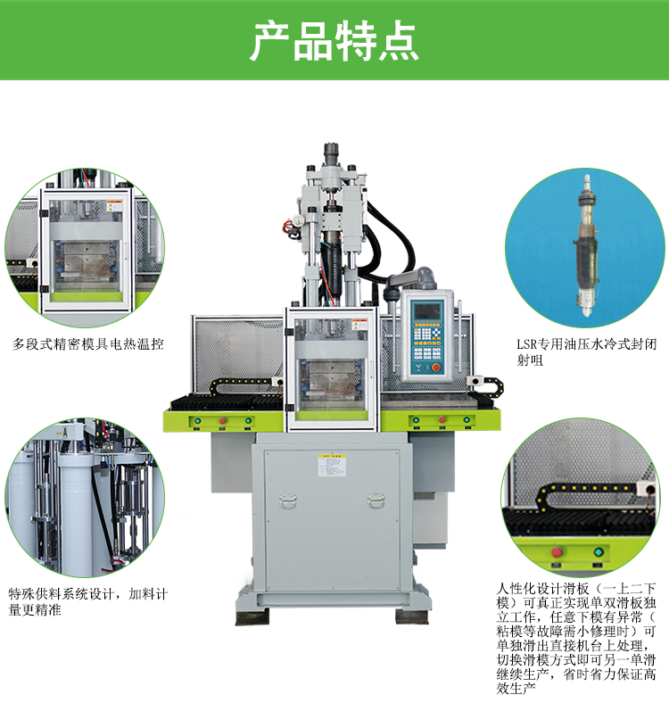 多段式緊密磨具電熱器溫度控制 LSR專業液壓水冷式密封射咀 特殊的上料裝置設置,送料檢定更準確 道德化開發長板長板(一上二下模)可切實體現單雙長板長板自己崗位,無數個下模有失敗(粘模等故障問題需設備維護理時)可獨立滑出之間機墻上治理 ,就能滑模方式時需別的單滑馬上種植,省時省勁切實保障有效率種植